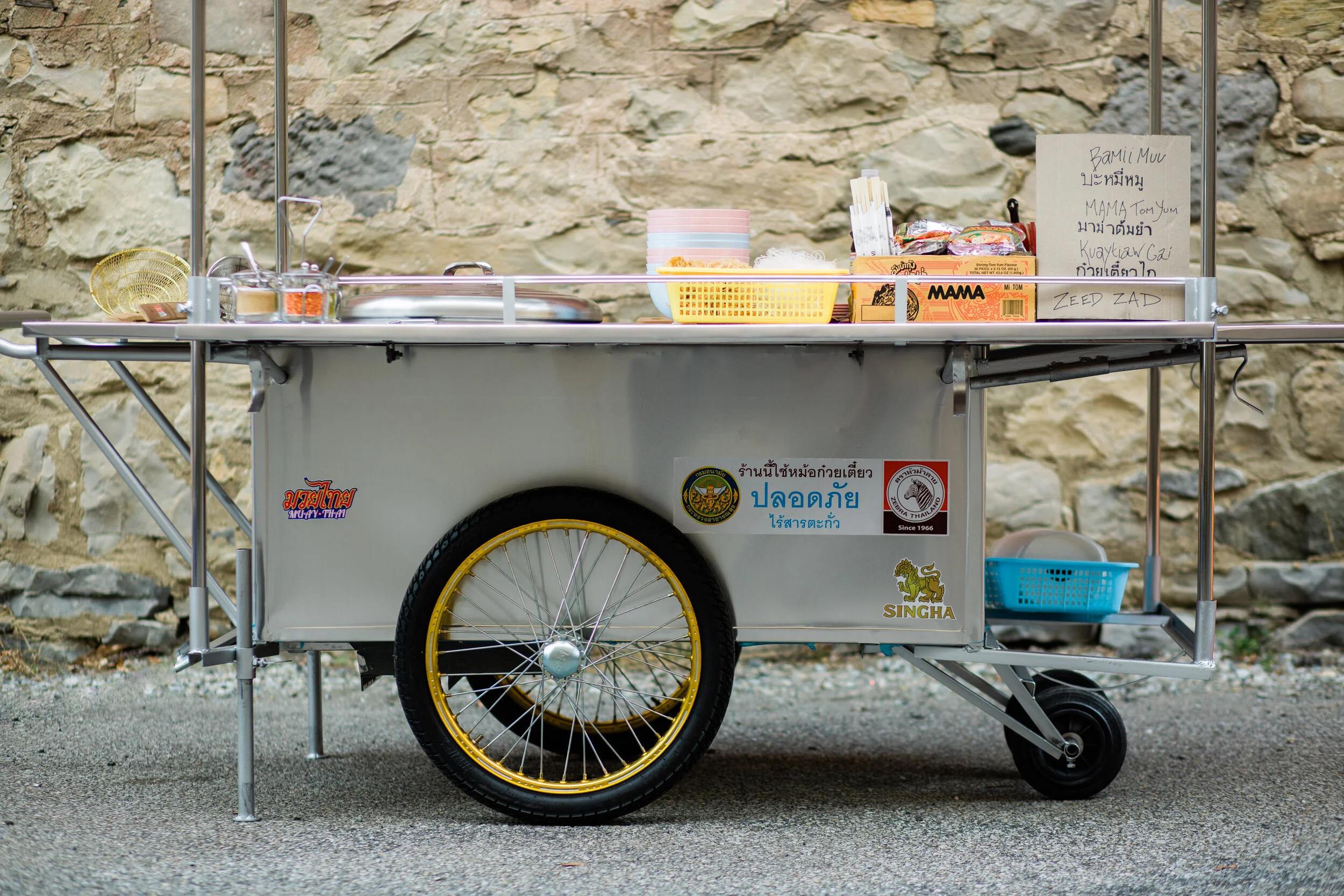 Walk down almost any street in all of Thailand and you will see a “rodkhen,” or street vendor cart, selling all types of sweet and savory Thai offerings. Our cart, lovingly named “The S.S. Willow,” was custom built in Bangkok and shipped by boat to New Jersey. Down in the engine room, a propane burner powers a three-chambered pot built to churn out noodles in a flash.